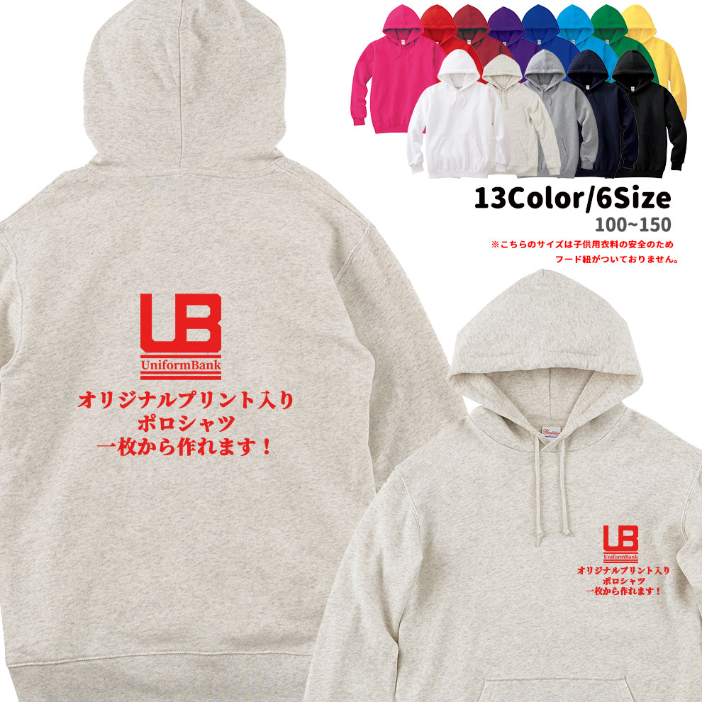 オリジナルプリント入り フ—ディッドライトパーカー 【100〜150/背中】 男女兼用 無地 おもしろ プレゼント 名入れ ユニフォーム 制服
