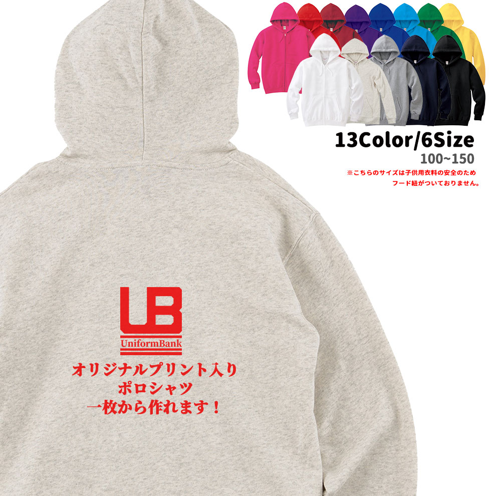 オリジナルプリント入り ジップアップパーカー 【100〜150/背中】 男女兼用 無地 おもしろ プレゼント 名入れ ユニフォーム 制服